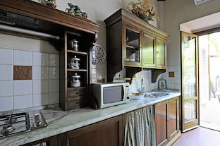 complete keuken met koelkast, 4-pits-gasfornuis, magnetron, perculator, Ital. cafétière en alle kook- en eetgerei;
