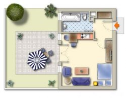Beschrijving luxe studio's voor 1 - 2 personen (begane grond en 4e etage met tuin en terras of balkon: