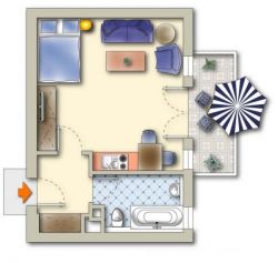 Comf. studio voor 1-2 personen op 4e etage met lift en balkon (geschikt voor minder validen met rolstoel):